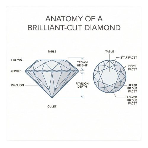 A diamond is composed of two primary sections: the crown and the pavilion. The proportions and relationship between these areas—particularly the table and depth percentages—play a crucial role in how effectively a diamond reflects light and produces sparkle.